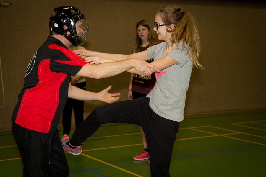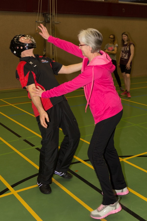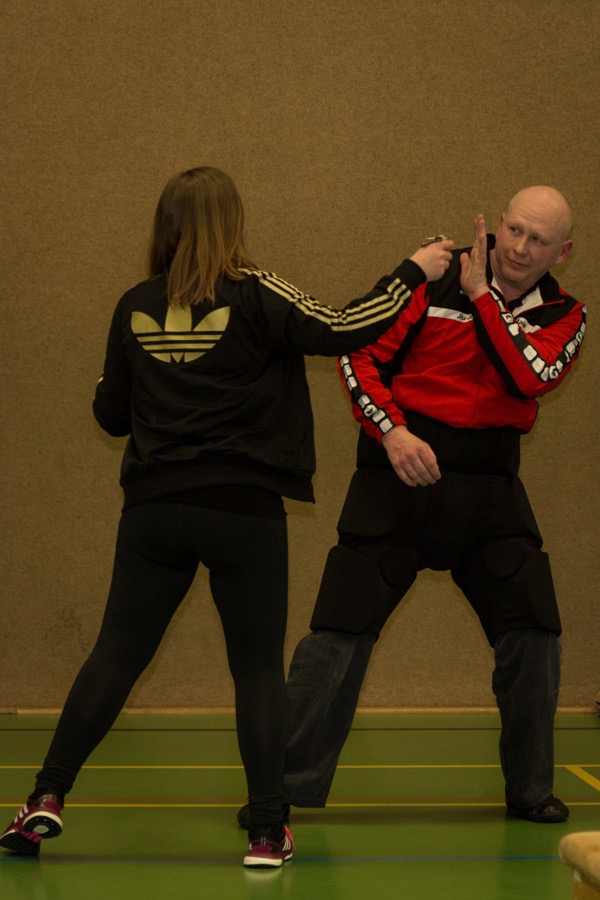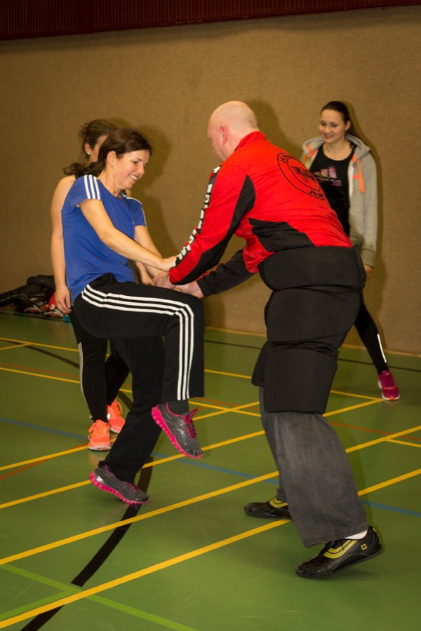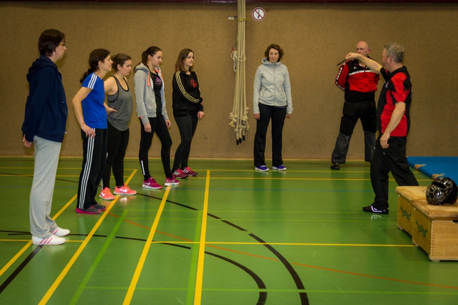 Sie haben den ca. 15 Teilnehmerinnen Maßnahmen zur Selbstverteidigung gezeigt. Dabei wurde zuerst die Theorie vermittelt und anschließend durften die Frauen praktisch trainieren. Die Trainer waren dabei gut gepolstert so dass auch ordentlich zugeschlagen und getreten werden durfte. Die Maßnahmen eignen sich sowohl gegen Bekannte die z.B. auf einer Feier etwas zu nah kommen als auch gegenüber fremden Personen die auf der Straße jemanden ernsthaft belästigen. Als Hilfsmittel wurden häufig die eigenen Hände und Füße verwendet, aber auch der Einsatz von Regenschirmen und des Kubotan wurde vermittelt.