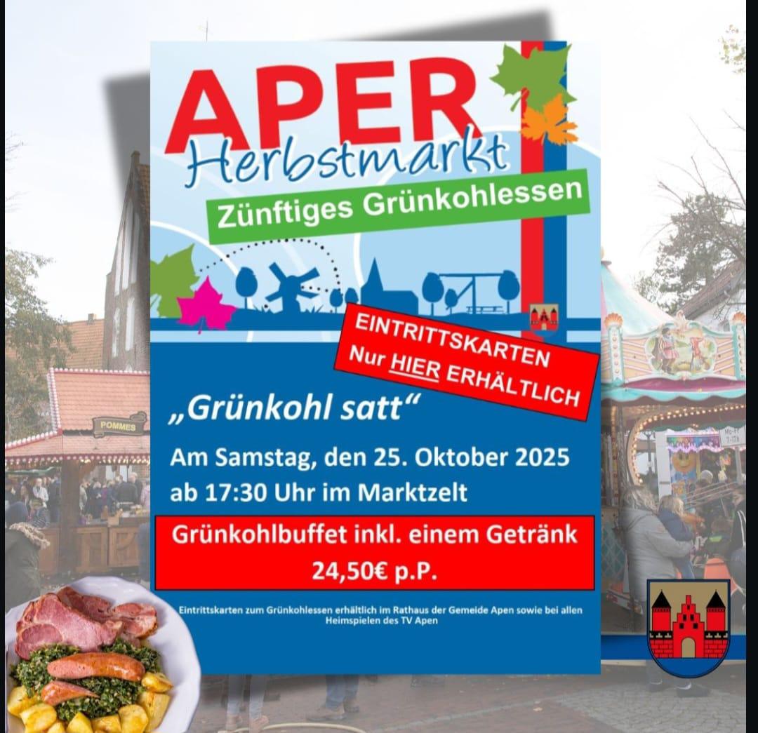 Am Markt-Samstag (25.10.2025) geht in Apen auf dem Marktplatz die Post ab und unser TV ist mittendrin! Sowohl beim Grünkohlessen als auch bei der großen Zelt-Party am Abend mit lokalen DJ-Größen werden wir uns um eure Getränkeversorgung kümmern.