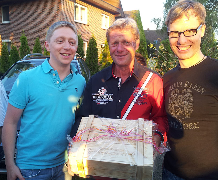 in Form einer Flasche Hochprozentiges nebst passenden Gläsern, alles natürlich mit dem Wappen seines Lieblingsvereins graviert. Anschliessend wurde in Schweer's Ehrentag in seinem Garten noch ordentlich gefeiert.