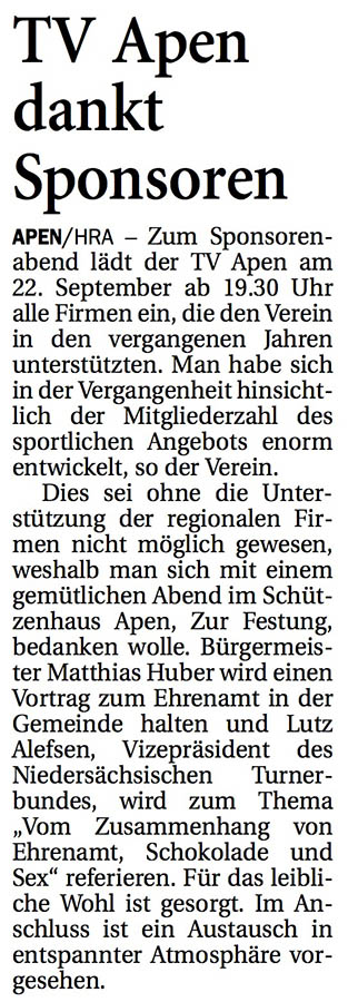 Der Turnverein Apen hat im Rahmen eines Wettbewerbs des Landessportbundes Niedersachsen und der BKK 24 einen attraktiven Preis gewonnen: Neben einer Teilnehmerprämie von EUR 180 € erhielten zusätzlich 5 Vereine