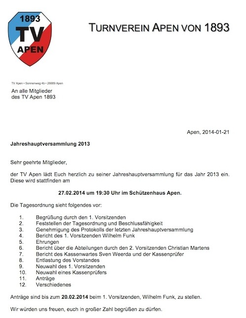 Die Jahreshauptversammlung des TV Apen für das Jahr 2013 wird am 27.02.2014 um 19:30 Uhr im Schützenhaus in Apen stattfinden.