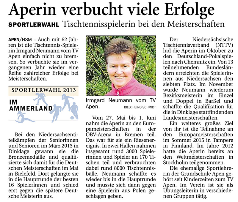 Irmgard Neumann wurde bei der NWZ-Wahl als Sportlerin des Jahres nominiert. Irmgard ist eine absolute Stütze des TV Apen:
