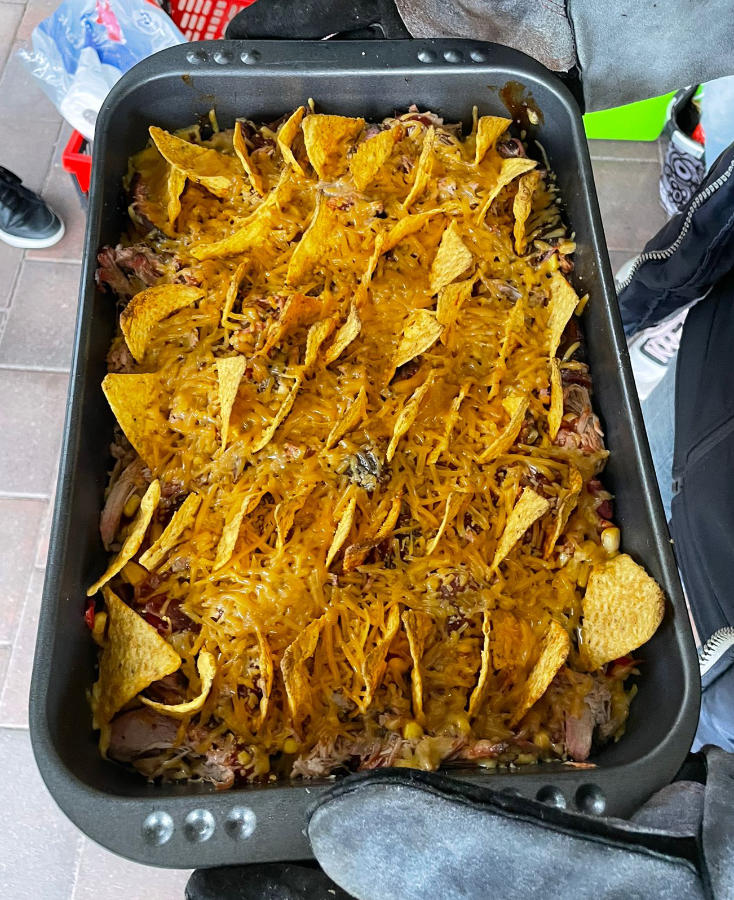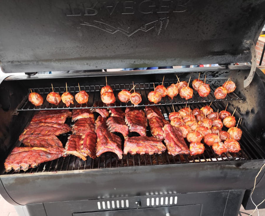 Nach der sportlichen Betätigung wartete auf die Radlerinnen und Radler ein wohlverdienter kulinarischer Höhepunkt: René Müller und Lars Stederoth hatten bereits seit Samstagmorgen am Vereinsheim ihre Smoker angeheizt und versorgten die hungrige Truppe mit leckeren Moinkballs, Rippchen und vielen anderen Leckereien sowie allerlei Beilagen und Saucen.