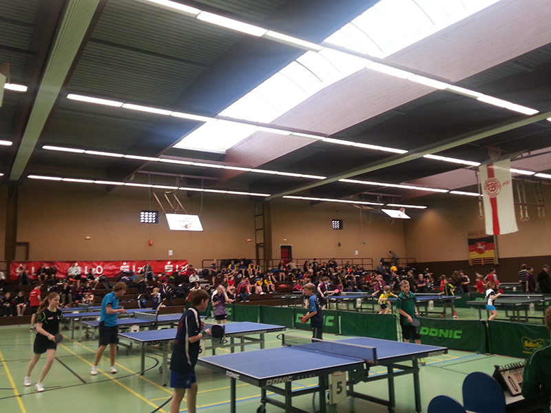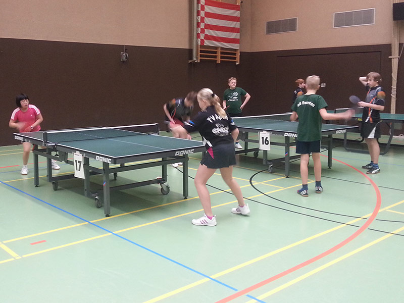 An zwei Tagen hieß es dann für unsere Aper: Alles geben und kräftig gegen die weiße Zelluloidkugel schlagen, damit man sich den ein oder anderen begehrten Sachpreis ergattern konnte. Jasmin Braun hat dies auch in ihrer Klasse der Schülerinnen B geschafft: Nach sehr spannenden und zum Teil wirklich knappen Spielen, konnte sie sich in ihrer Altersklasse einen sehr guten dritten Platz sichern. Tom-Ole Theilken, Steffen Weerts, Lennart Perenthaler und Kai Ebken, die alle in der Schüler A – Klasse gestartet sind, konnten zwar gut mithalten, dennoch hat es nicht ganz für eine Platzierung auf dem Siegertreppchen gereicht. Die jüngsten Teilnehmer in der Klasse der Schülerinnen C bzw. der Schüler C, Lukas Kreklau, Xenia Kreklau und Laura Weerts mussten sich nach der Gruppenphase geschlagen geben, einzig Julian Theilken konnte die Gruppenphase der Schüler C erfolgreich überstehen. In der darauffolgenden Hauptrunde allerdings, konnte auch er sich gegen seinen stärkeren Gegner nicht durchsetzen, sodass eine Platzierung unter den ersten Dreien ausblieb.