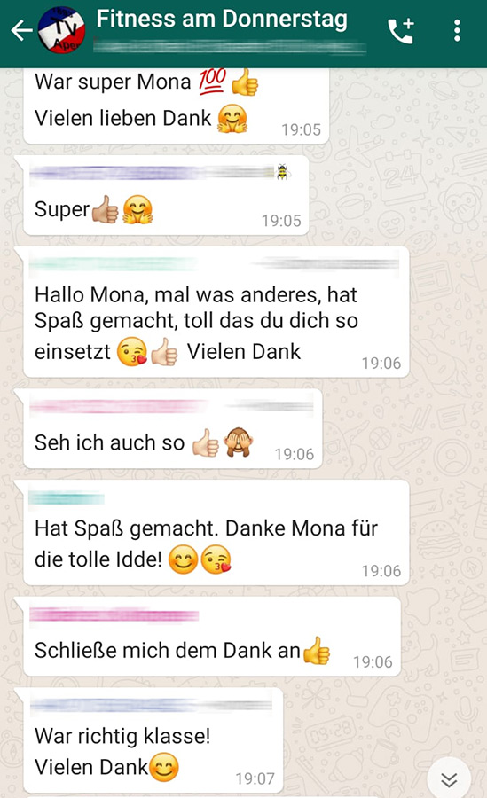 Nach kurzen technischen Herausforderungen ging es los: Mona führte typische Bauch-Beine-Po-Übungen vor, ohne die in der Halle verfügbaren Hanteln, Terrabänder und sonstige Fitnessgeräte zu benutzen. Somit konnte wirklich jeder mitmachen. Das Feedback am Ende der Stunde was großartig. Viele haben sich per WhatsApp Chat bedankt und wollen bei der nächsten Stunde wieder dabei sein.