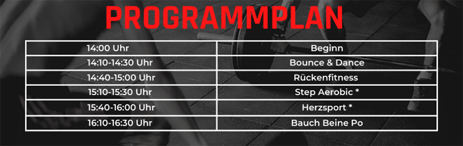 Wir werden euch im Rahmen dieses Schnuppertags die Gruppen Bounce & Dance, Step Aerobic*, Rückenfitness, Bauch Beine Po und Herzsport* vorstellen. Wichtig: Beim Step Aerobic und Herzsport wird um vorherige Anmeldung gebeten! Hier seht ihr den Zeitplan für den Nachmittag: