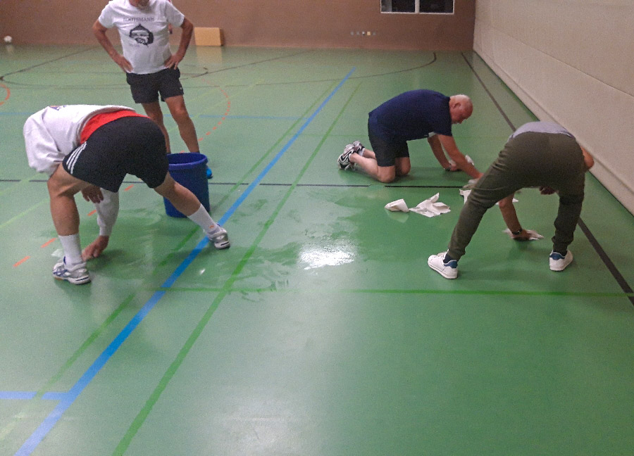 Um die Unfallgefahr zu reduzieren, werden zunächst die Wasserflecken vom Hallenboden entfernt. Für alle anwesenden Sportler eine willkommene Abwechslung. Es bestehen lediglich Bedenken, dass die Ehefrauen auf den Fotos erkennen könnten, zu welch enormen Tätigkeiten die Ehemänner fähig sind.