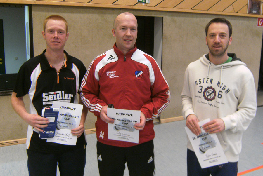 Und nach großen Worten haben sie auch gleich Taten folgen lassen. Zwar hatte Rolf Lühring zu Beginn noch leichte Schwierigkeiten und gewann das erste Spiel nur knapp in drei Sätzen, aber von der Nervosität zu Anfang war später im Verlauf des Turniers nichts mehr zu spüren und so zog er ohne größere Mühe ins Finale ein. Dort wartete dann sein Vereinskollege Alexander Buß der das Halbfinale gegen seinen Gegner aus Magdeburg zwar mit Mühe, aber am Ende dann doch leistungsgerecht bezwang und somit ebenfalls im Endspiel stand. Damit war es also ein vereinsinternes Finale das Alexander Buß dann recht eindeutig für sich endscheiden konnte. Am Ende standen also Alexander Buß auf dem obersten und Rolf Lühring auf dem zweithöchsten Treppchen. Dritter wurde Björn Staats vom Veranstalter TV Metjendorf.