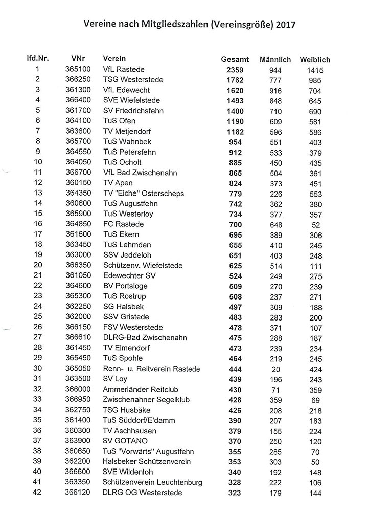 Mit Freude (und ein wenig Stolz) blicken wir auf die vom Kreissportbund veröffentlichte Mitgliederstatistik. Unser Verein ist mit 824 Mitgliedern kurz davor zu den 10 größten Ammerländer Sportvereinen zu gehören.