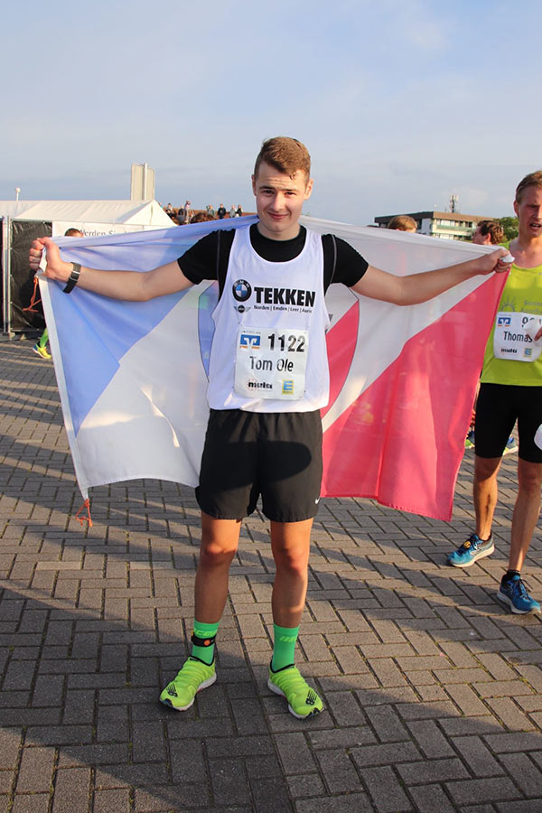 Nicht zu stoppen war auch Pressewart Tom Ole Theiken. Der 18-Jährige verteidigte auch auf den letzten drei Etappen und 32,4 Kilometern, das „Leadertrikot“ der Jugendwertung und stand somit in Bensersiel ganz oben auf dem Treppchen. Für die sechs Etappen blieb er mit einer Zeit von 3:59:41 sogar als nur einer von 11 Athleten unter der 4-Stunden-Marke. Neben dem Triumph in der Nachwuchswertung (mit mehr als 3 Minuten Vorsprung und inkl. sechs Etappensiegen), pulverisierte Theilken auch seine eigene zehn Kilometerbestzeit und blieb auf der 4. Etappe auf 10.000 Meter erstmals unter 37:00 Minuten. Auf der letzten Etappe des diesjährigen Ossiloops wurde Tom Ole zudem Fünfter im gesamten Feld. Insgesamt schob er sich noch in der Gesamtwertung auf Platz 11 vor. Im Ziel warteten bereits Schweer und Marianne Meyer auf den „Toplooper“ mit „TV Apen Sekt“ sowie mit einer Flagge, um den Erfolg angemessen zu feiern.