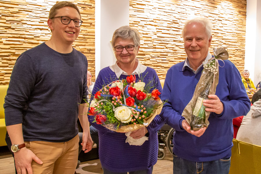 Eine besondere Ehrung wurde schließlich unseren Gastgebern noch zuteil: Marianne und Fritz Eilers haben mit ihren nun jeweils 60 Mitgliedsjahren einen neuen Bestwert aufgestellt, was mit einem großen Blumenstrauß in Vereinsfarben und einem edlen Tropfen belohnt wurde. Schließlich ist eine diamantene Vereinsmitgliedschaft schon außergewöhnlich.