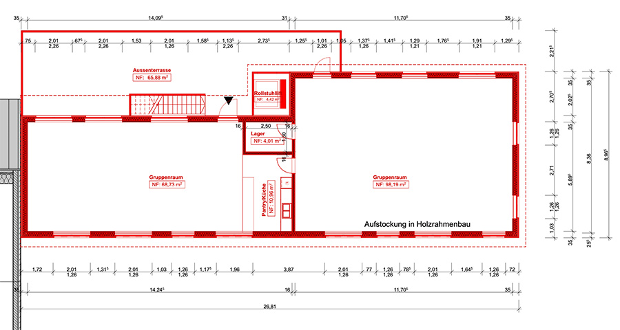 Da uns Kopf in den Sand stecken allerdings nicht so liegt, haben wir bereits einen neuen Ansatz entwickelt, den wir seit der Ablehnung durch den Gemeinderat nun tatkräftig verfolgen: Wir wollen unser Umkleidegebäude am Festungsstadion um ein weiteres Vollgeschoss wachsen lassen. Wie das ganze aussehen könnte, seht ihr im oben dargestellten Foto. Es handelt sich dabei um einen etwa 100 qm großen Bewegungsraum für Sportgruppen von etwa 12 Personen. Zudem entsteht daneben ein Begegnungsraum, in dem wir unsere Sitzungen, Theorieeinheiten und andere Zusammenkünfte der Abteilungen durchführen können. Zudem ist ein kleiner Abstellraum für Sportgeräte vorgesehen. Um das zweite Obergeschoss auch allen Menschen zugänglich zu machen, ist ein Lift genauso eingeplant, wie ein behindertengerechtes WC im Erdgeschoss. Hier seht ihr den Grundriss des geplanten Obergeschosses zum jetzigen Planungsstand: