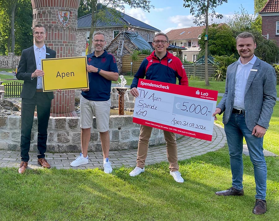 Und das "groß" bezieht sich nicht nur auf das Format des Schecks im XXL-Format, den unsere Verantwortlichen von Jan Willjes, Thede Ohmstede und Dieter Harms als LzO-Vertreter entgegennehmen durften, sondern auch auf die Summe der Zuwendung: Satte 5.000€ werden unserem Vereinskonto dank dieser großzügigen Spende gutgeschrieben! Das Geld soll für die Ausstattung einer Küche und die Beschaffung einer Spiegelwand für die neue Bewegungs- und Begegnungsstätte eingesetzt werden, die als Aufstockung auf unser Umkleidegebäude entstehen soll.