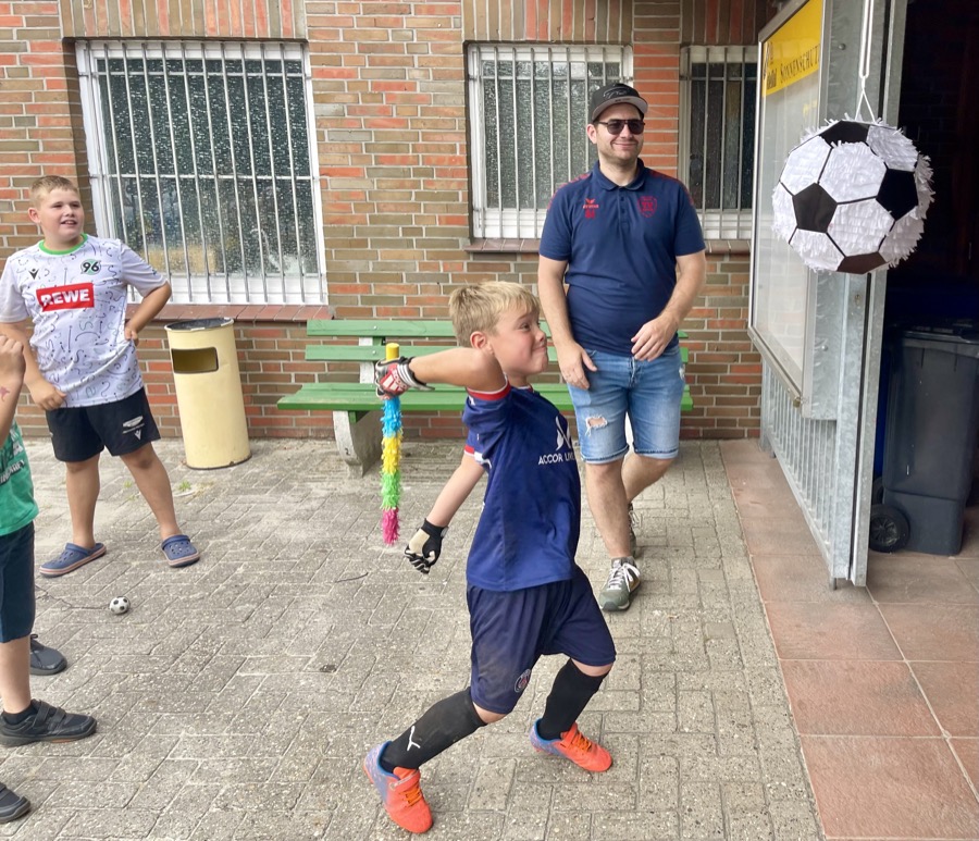 Für die Kinder gab es reichlich Bespaßung. Svenja klebte Tattoos, die Kids prügelten Süßigkeiten und Luftballons aus einer Fußball-Pinata und an der Heliumflasche wurden aus den Ballons begehrte Flugobjekte, von denen einige im Aper Himmel über dem Festungsstadion verschwanden.