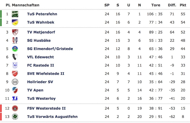 Und dieser Punkt hat tatsächlich noch Auswirkung auf die Tabelle: Da der Nachbar aus Westerloy mit 8:0 gegen Metjendorf verliert, zieht Apen nach Punkten gleich und überholt die Pottholf-Elf aufgrund des besseren Torverhältnisses, so dass man diese Saison am Ende nun vor Augustfehn, Westerstede und Westerloy auf Platz zehn der Tabelle beendet.