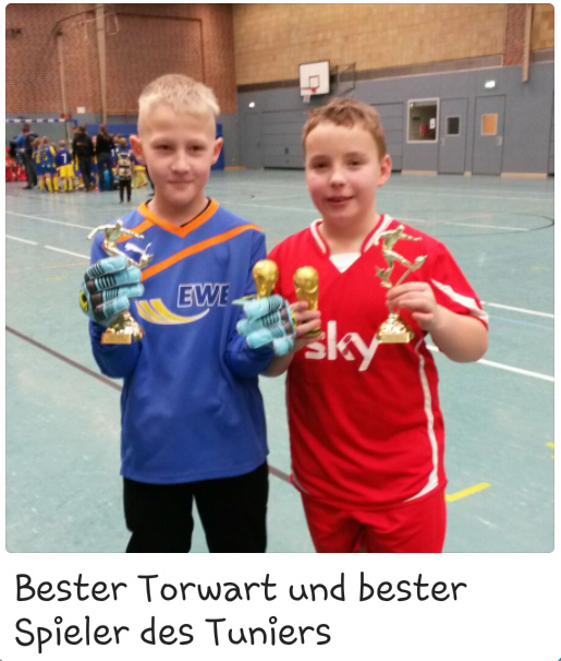 Was man zu dem Zeitpunkt noch nicht wusste: Bei der Siegerehrung gab es noch Pokale für zwei Spieler vom TV Apen. Für den besten Torwart des Turniers ging der Pokal an Dennis Bröhm und den zweiten Pokal bekam der beste Spieler des Turniers: Marek Wortmeyer, der auch die zweitmeisten Tore des Turniers schoss. Damit konnten man sehr zufrieden sein und die Heimreise nach Apen antreten.