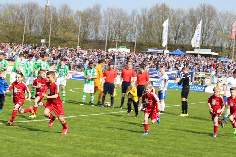 So nah am Geschehen in einer wichtigeren Partie waren wohl bisher nur wenige und nach einigen kurzen Einweisungen zum Ablauf und Gesprächen mit den Regionalligaspielern ging es dann auch schon los. Stolz liefen alle auf das Feld. Der Stadionsprecher stellte uns kurz vor und die Haupttribüne und danach der Fanblock wurden begrüßt. Im Anschluß flitzten unsere Spieler vom Feld und nahmen im Sparda-Block A bei ihren Eltern und Trainern Platz, um das Spiel zu verfolgen. Und es sollte eine aufregende Partie werden.