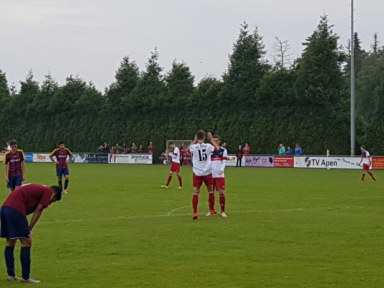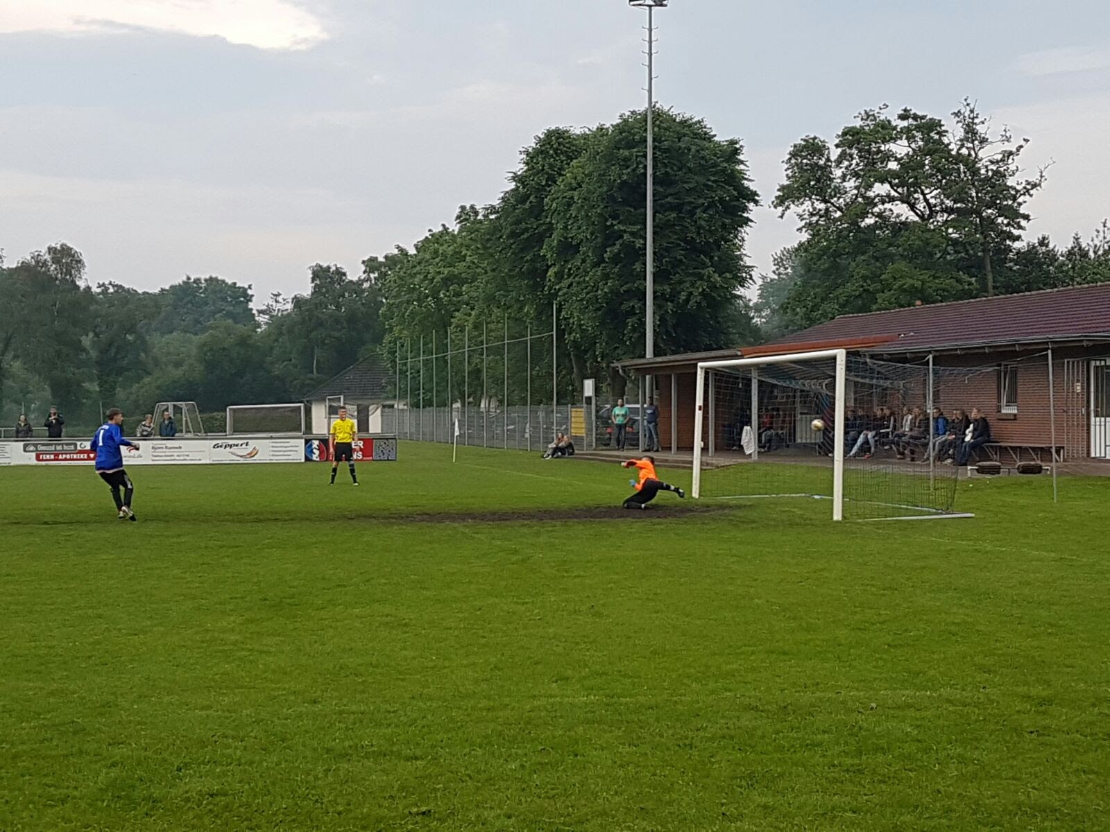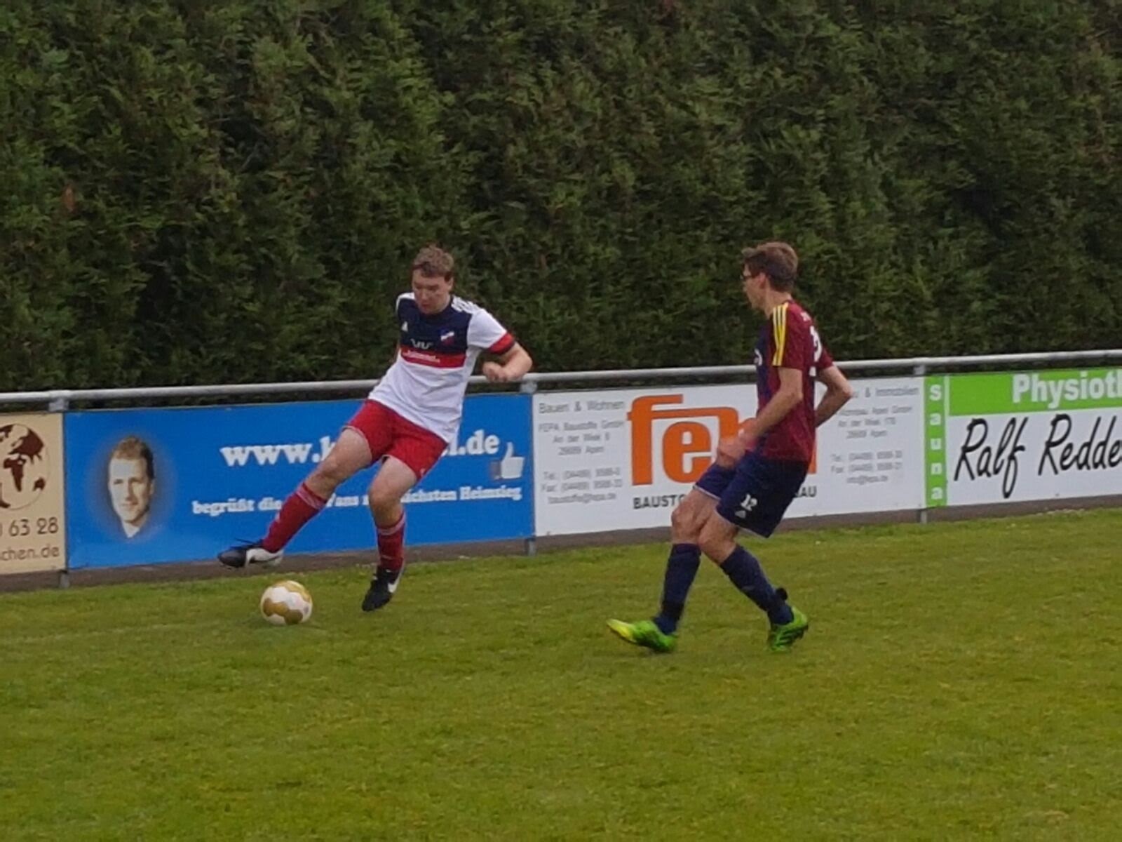 Die Aper waren fest entschlossen den Klassenerhalt vorzeitig zu sichern und die erfolgreiche Serie fortzusetzen. Trotz dass die Hausherren nach nur wenigen Sekunden durch Nils Mundt zur ersten Torchance kamen, waren die Anfangsminuten eher zerfahren und ohne Struktur. So kamen neben Paul Borchers und Patrick Bahr auch die Gäste durch zwei Fehler in der Aper Hintermannschaften zu Torchancen. Nach gut zehn Minuten Spielzeit lief der Aper Motor immer besser an. Nur wenig später jubelten die Zuschauer zum ersten Mal. Nils Mundt streichelte eine Vorlage von Patrick Bahr gerade so zum 1:0 über die Torlinie. Kurz darauf war es Patrick Bahr selbst, der nach Vorarbeit von Dustin zu-Jeddeloh, den Ball vom rechten Strafraumeck ins Tor knallte. Nicht wenig schöner dann das Tor von Dustin zu-Jeddeloh, der per Direktabnahme den Ball aus ca. 18 Metern in die Maschen schickte. Sekunden später feierten Niklas Lährl und Kai Emmel ihren persönlichen Hattrick. Wie schon zwei Mal zuvor erzielte Niklas Lährl nur eine Minute nach seiner Einwechslung einen Treffer. Diesmal netzte er einen perfekt geschossenen Freistoß von Fabian Rosendahl ein. Kurz vor dem Pausenpfiff erhöhte Nils Mundt noch auf 5:0.
