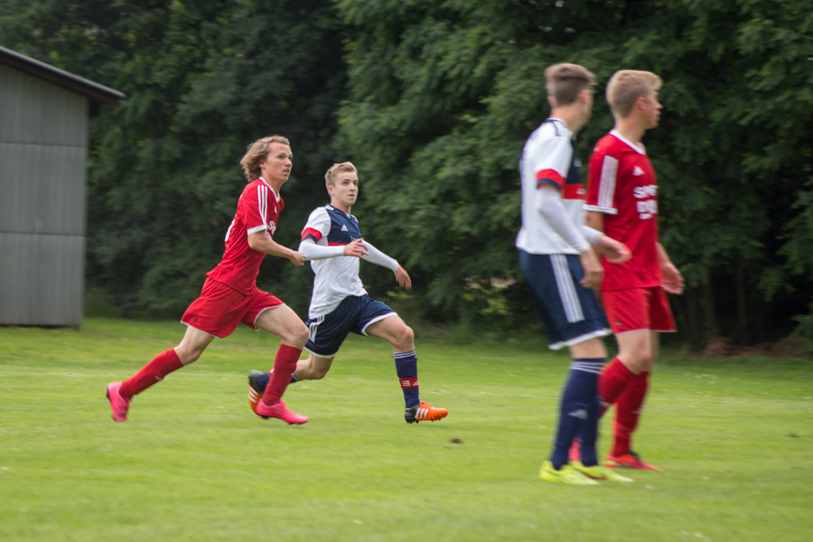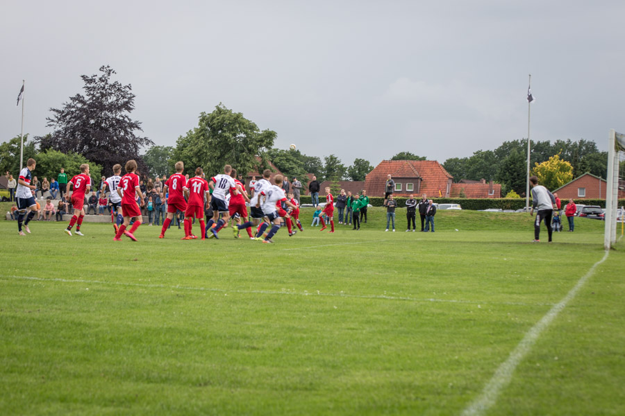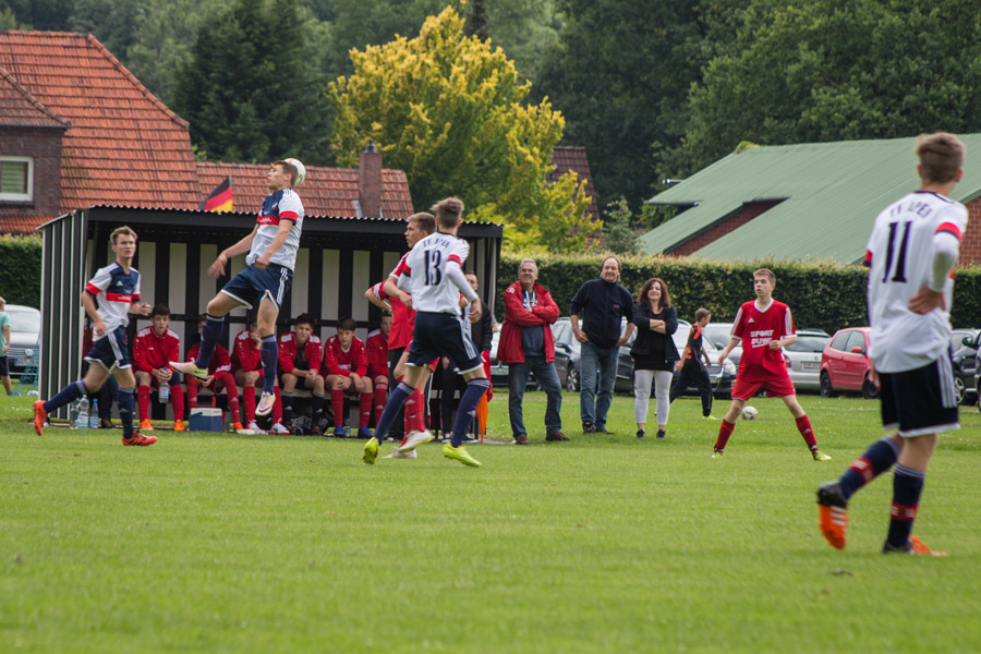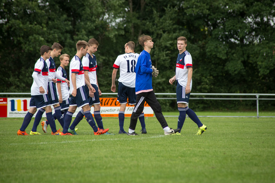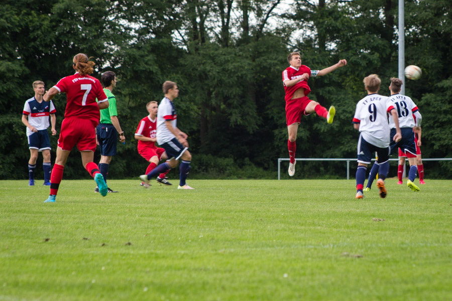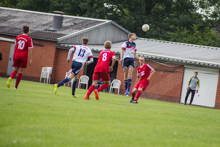 Die favorisierten Aper nahmen direkt das Heft in die Hand und drückten auf die schnelle Führung. Allerdings fehlte die letzte Genauigkeit in den Aktionen, was wohl den Schulabschlussfeiern geschuldet war. Trotzdem gab es Tormöglichkeiten die aber nicht genutzt wurden oder durch den Linienrichter als Abseits bewertet wurden. Die sehenswerteste Aktion hatte zunächst Nikas Wildemann, der nach einer guten Viertelstunde fast per Fallrückzieher erfolgreich war. Nach 21 Minuten gab es dann etwas Zählbares für den Bezirksligisten. Mit einem satten Fernschuss drosch Dustin zu-Jeddeloh den Ball flach in die Ecke. Sagen zu Folge soll der gegnerische Torwart durch die Wucht mit dem Ball ins Tor geflogen sein. Daraufhin verpassten es die Aper frühzeitig den Deckel drauf zu machen und so kamen die gut kämpfenden Westerstede wieder ins Spiel. Wie aber schon gewohnt, ließ das Abwehrbollwerk von der Norderbäke nichts zu, sodass Tewe Buskohl das gesamte Spiel über ohne nennenswerte Aktion blieb.