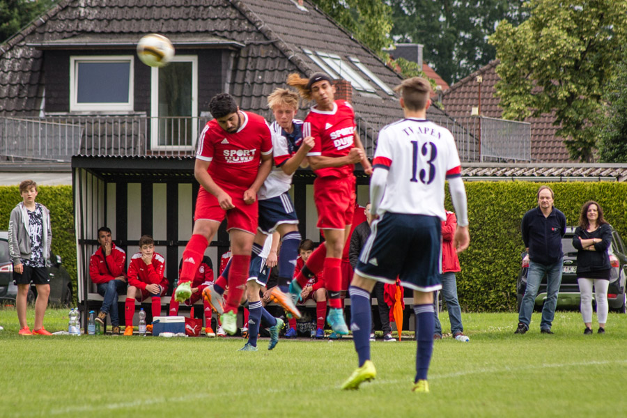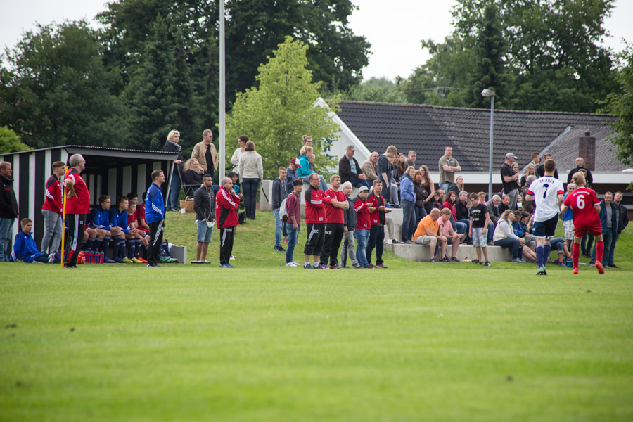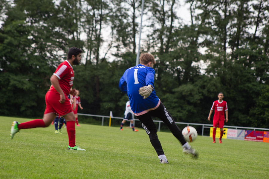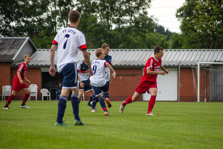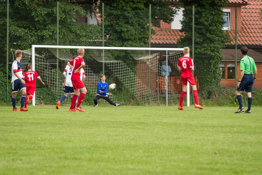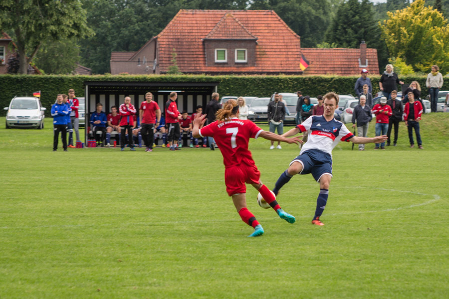 Die favorisierten Aper nahmen direkt das Heft in die Hand und drückten auf die schnelle Führung. Allerdings fehlte die letzte Genauigkeit in den Aktionen, was wohl den Schulabschlussfeiern geschuldet war. Trotzdem gab es Tormöglichkeiten die aber nicht genutzt wurden oder durch den Linienrichter als Abseits bewertet wurden. Die sehenswerteste Aktion hatte zunächst Nikas Wildemann, der nach einer guten Viertelstunde fast per Fallrückzieher erfolgreich war. Nach 21 Minuten gab es dann etwas Zählbares für den Bezirksligisten. Mit einem satten Fernschuss drosch Dustin zu-Jeddeloh den Ball flach in die Ecke. Sagen zu Folge soll der gegnerische Torwart durch die Wucht mit dem Ball ins Tor geflogen sein. Daraufhin verpassten es die Aper frühzeitig den Deckel drauf zu machen und so kamen die gut kämpfenden Westerstede wieder ins Spiel. Wie aber schon gewohnt, ließ das Abwehrbollwerk von der Norderbäke nichts zu, sodass Tewe Buskohl das gesamte Spiel über ohne nennenswerte Aktion blieb.