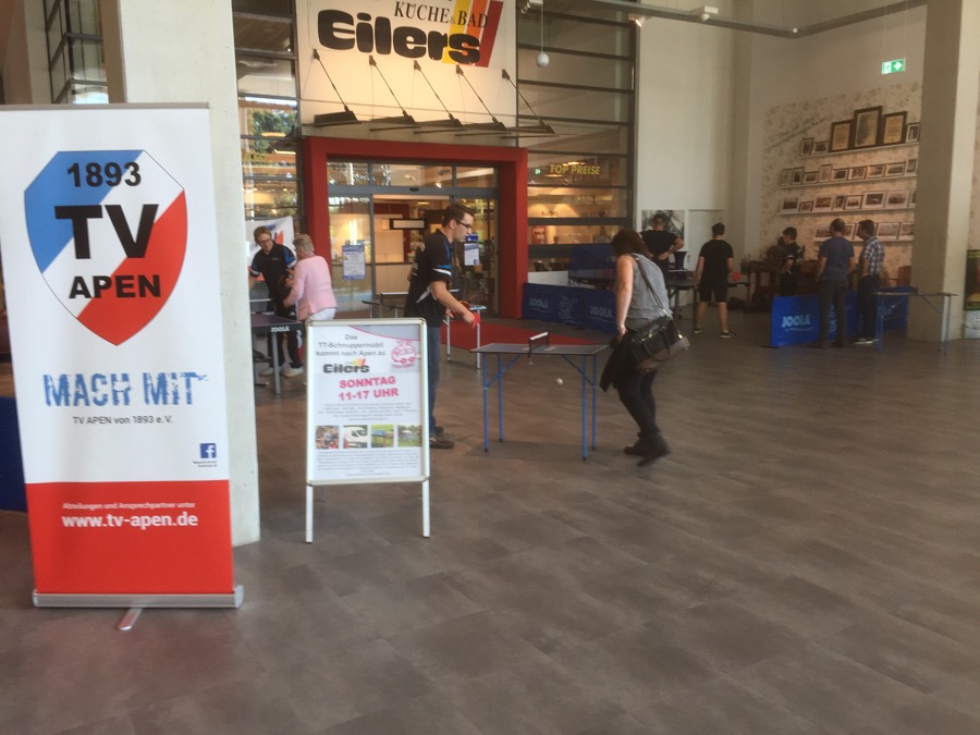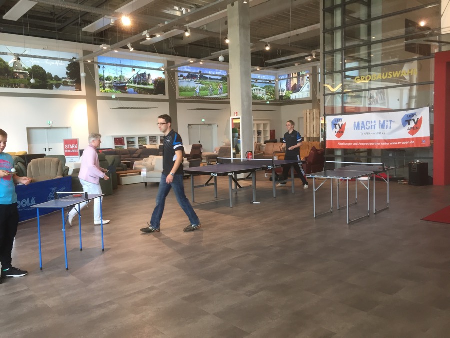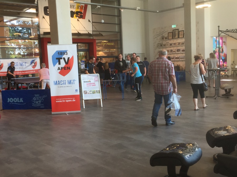 Unter dem Slogan: „ TV Apen - MACH MIT!“ wurde außerdem kräftig für unsere Tischtennisabteilung geworben. „Wir haben gehofft natürlich mit dieser Aktion viele Besucher für den Tischtennissport zu begeistern, um diese vielleicht bald bei uns im Verein begrüßen zu können. Dies ist uns auch wirklich sehr gelungen. Außerdem bedanke ich mich bei allen aktiven Spielern, welche sich ehrenamtlich an diesem Event beteiligt und geholfen haben“,freute sich der stellvertretende Vorsitzende des TV Apen und Spieler der I. Herren Christian Martens.