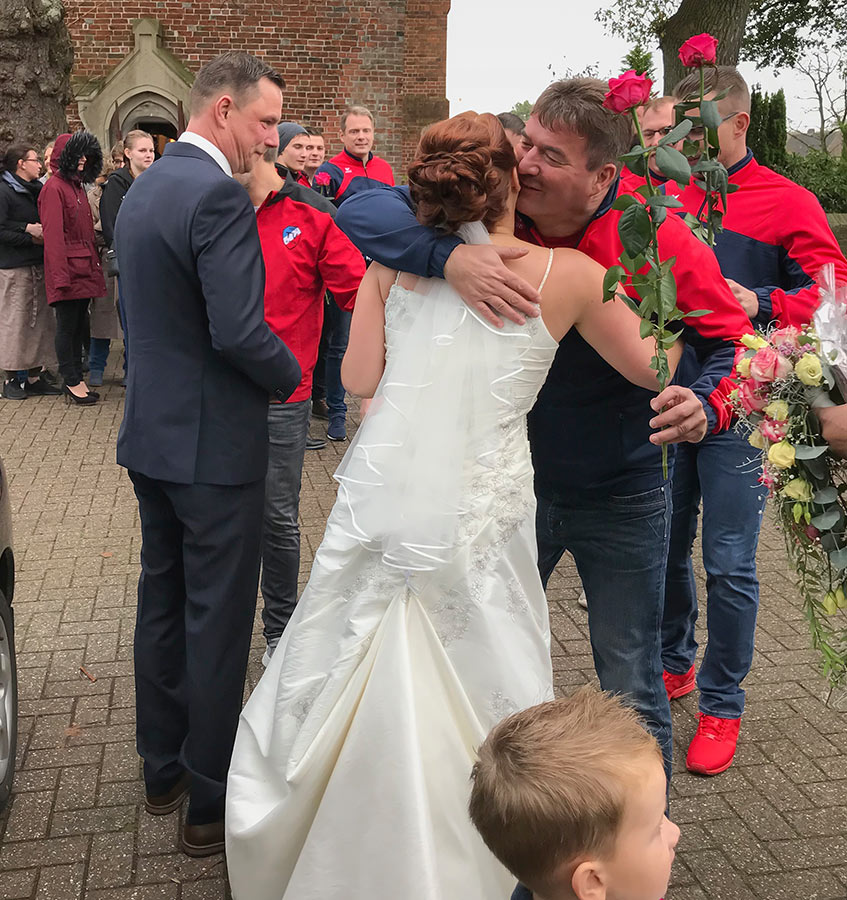 Sein Team ließ es sich dabei natürlich nicht nehmen, den beiden ein gebührendes Spalier zu bieten und so stand die zweite Herren am Kirchenausgang mit Fahnen und Rosen ausgestattet und beglückwünschte ihren Coach zum Volltreffer.