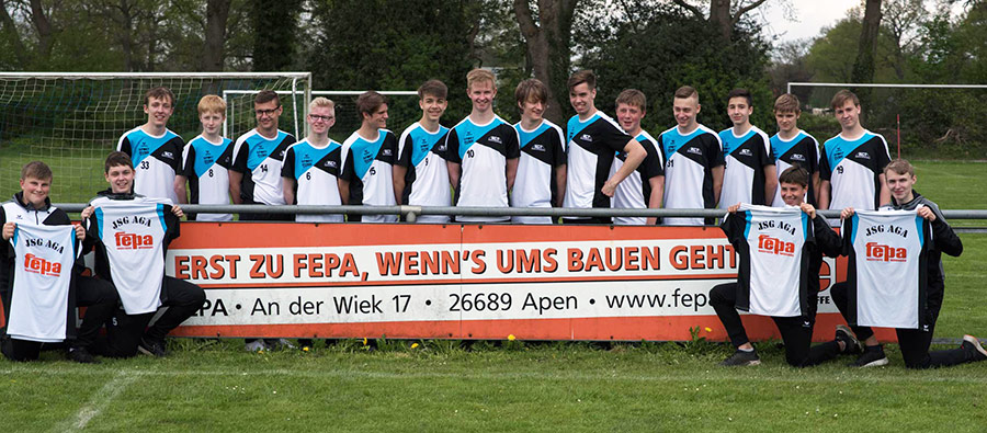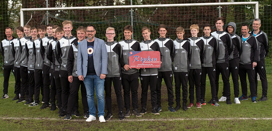 Die Jungs von der B1 machen schon seit dem Herbst auch durch neue Trainingsanzüge und Aufwärmshirts eine gute Figur. Nach dem Heimspiel gegen den VFL Oldenburg II ergab sich die Gelegenheit, sich bei den Sponsoren zu bedanken.