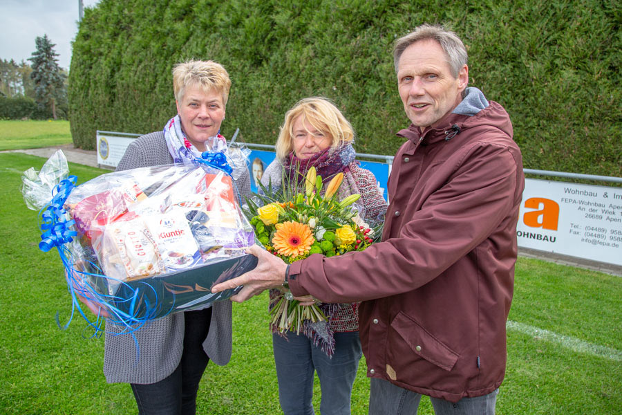 Gleich für 16 Spieler und die Trainer konnte  man die Anzüge heute Nachmittag im Aper Festungsstadion in Empfang nehmen. Dabei bedankten sich die Eltern, die die Aktion initiiert hatten, mit einem dicken Blumenstrauß und einem reich bestückten Präsentkorb bei Sponsor Roland Rüchel und seiner Frau. Auch seitens des Vereins fand Maik Janßen als Vorstandsvertreter einige warme Worte und stellte die Bedeutung derartiger Unterstützung für unseren Verein heraus.
