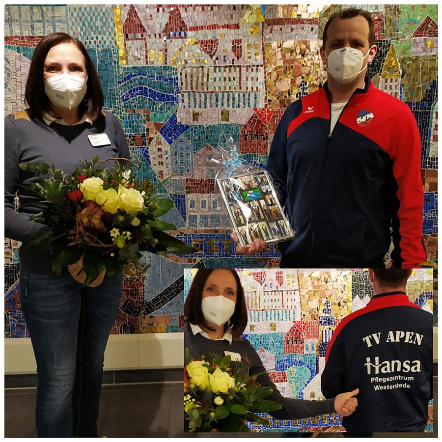 Frau Ebneter (Hausleitung des Pflegezentrums) hat sich über das Bild und einen Blumenstrauß riesig gefreut. Den Kontakt zum Pflegezentrum erstellte eine „Spieler-Mama“. Nochmal einen großen Dank an Nadine an dieser Stelle.