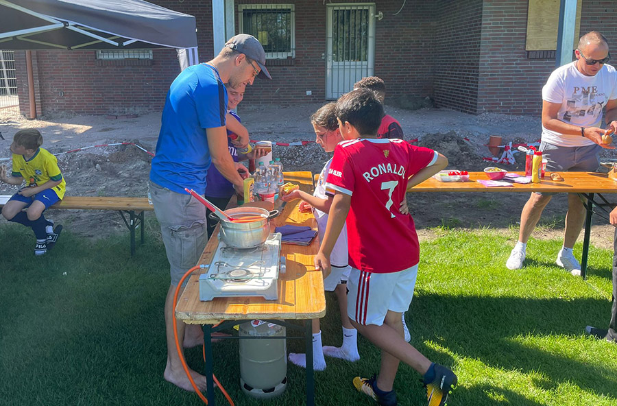 Gegen 12:00 Uhr gab es dann für alle Teilnehmer die verdiente Hotdog- und Getränkepause, ehe es dann mit dem Training weiterging. Schwerpunkt lag in dieser Einheit weniger auf anstrengende Übungen, da ab 15:30 noch ein Freundschaftsspiel auf dem Zettel stand. Zum Freundschaftsspiel kamen die Gäste der JSG HaBaFehn II, die in der 1. Kreisklasse im Raum Cloppenburg spielen. Zu Beginn merkte man unseren JSG-Kickern noch den Respekt vor den deutlich größeren Gästen an. Mit zunehmender Spieldauer setzte die Mannschaft aber die trainierten Spielzüge um, und zeigte deutliche technische Überlegenheit. So führten unsere Kicker nach der ersten Halbzeit 2:0 und konnten in der 2.HZ. sogar auf 3:0 erhöhen.
