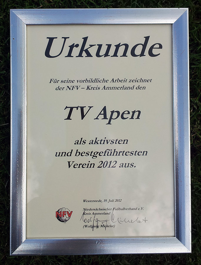 Im Rahmen dieser Veranstaltung erhielt dann auch unser Verein eine überraschende Auszeichnung: Unser TV ist laut NFV-Kreisverband der "aktivste und bestgeführte Verein 2012"! In seiner Laudatio wies der Vorsitzende des Fußballkreises Ammerland - Wolfgang Mickelat - auf die Entwicklung des TV Apen hin. Hier wurde nach der Auflösung der Spielgemeinschaft mit unseren Vereinsnachbarn TuS Vorwärts Augustfehn eine hervorragende Arbeit geleistet. Es wurde auf die vielen Aktivitäten des Vereines hingewiesen und auch auf die Tatsache, dass der Verein zukünftig wieder mit mehr Jugendmannschaften am Spielbetrieb teilnehmen wird.