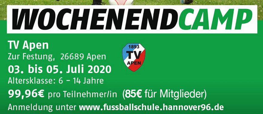 In diesem Jahr können wir für die jüngeren Kicker unserer Region erneut ein absolutes Highlight anbieten. Denn die Fußballschule des Zweitligisten von Hannover 96 kommt im Juli wieder für drei Tage nach Apen ins Festungsstadion!