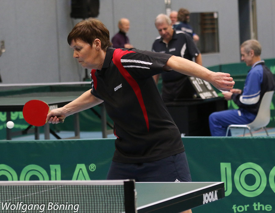 Gold und Doppel-Silber gewann Irmgard Neumann bei den Landesmeisterschaften der Senioren in Sandkrug. Im Einzel wurde die 66-Jährige Landesmeisterin, in den Doppeln Vize-Landesmeisterin.