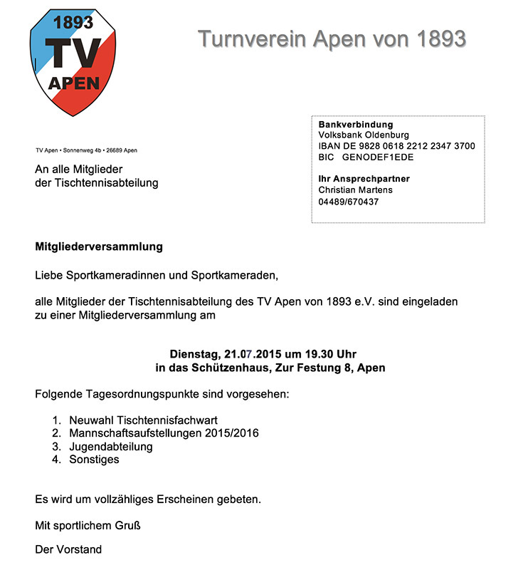 Wichtige Terminankündigung: Am kommenden Dienstag, dem 21.07.2015, findet ab 19:30 Uhr im Aper Schützenhaus die jährliche Versammlung unserer Tischtennisabteilung statt.