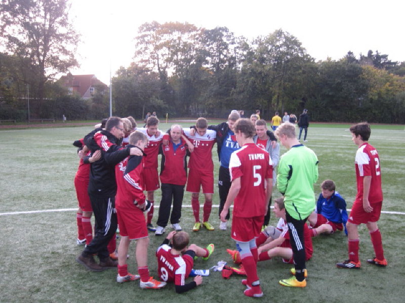 Am heutigen Samstag spielte unsere D-Jugend gegen die SG F'fehn/P'fehn 2. In der Kabine wurde die Mannschaft auf ein sehr schweres Spiel eingestellt, denn man konnte davon ausgehen, dass F'fehn/P'fehn unsere Tabellenführung haben wollte. Mit diesem Wissen und mit dem Selbstbewustsein aus dem letzten Spiel in Wiefelstede gingen wir bereits in der 8 Minute durch Julian in Führung. Im Kopf denkend, dass geht schon so weiter, hörten wir auf einmal auf mit dem Fußballspielen. Die Abstände zu unseren Gegenspielern waren viel zu groß, niemand störte den Gegner bei der Ballannahme, so dass diese immer besser ins Spiel fanden.