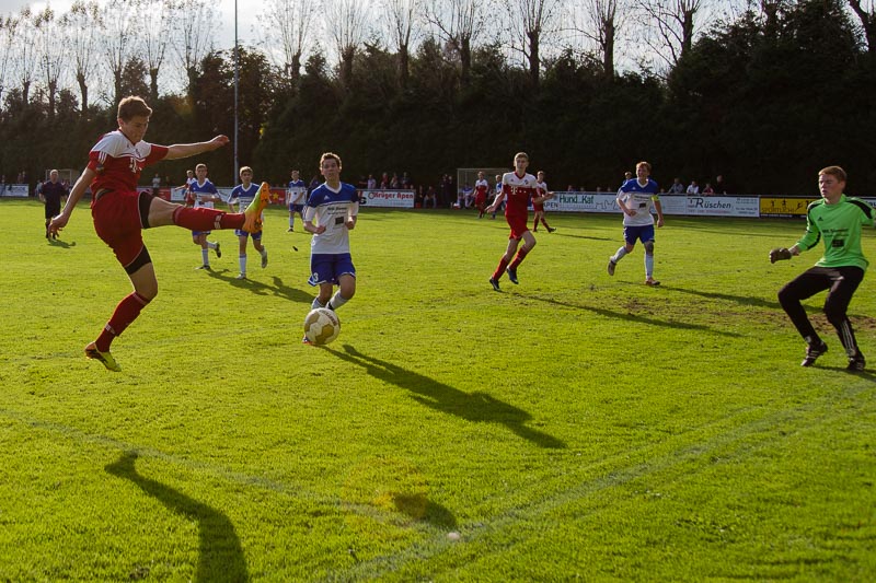 Am heutigen Samstag stand das Spiel der D-Jugend des TV gegen den Nachbarn aus Augustfehn auf dem Programm. Bei herrlichem Sonnenschein konnten die Trainer Fred und Hans Hermann auch heute wieder personell aus dem Vollen schöpfen. Anders aber als in den Spielen zuvor, als die Aper Mannschaft von Beginn an hellwach war, verschlief man die ersten 20 Minuten, so dass Augustfehn nach zwei Standardsituationen auf ein mal 2:0 führte. Diese Führung kam aus dem sogenannten Nichts, da Augustfehn sich nur auf die Defensive beschränkte, was sie allerdings auch sehr gut gemacht haben und mit ihren wenigen Kontern immer wieder gefährlich waren.