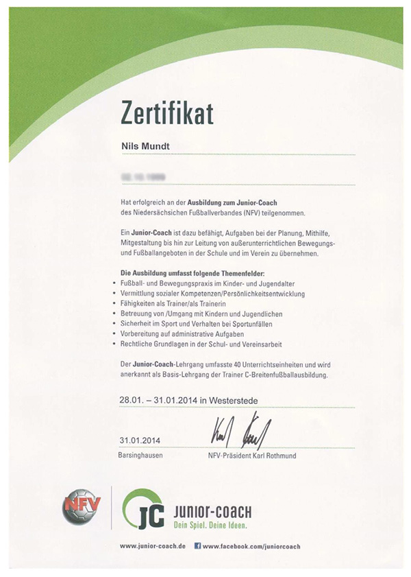 Am heutigen Freitag haben unsere Nachwuchsfußballer aus der C-Jugend, Dustin zu Jeddeloh und Nils Mundt ihre Prüfung zum "Junior-Coach" bestanden.