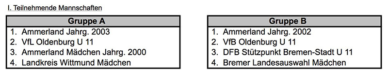 Hier treffen Auswahlen aus dem Ammerland, Oldenburg, Wittmund und Bremen aufeinander, so dass Jugendfußball in seiner feinsten Spielart zu erwarten sein dürfte.