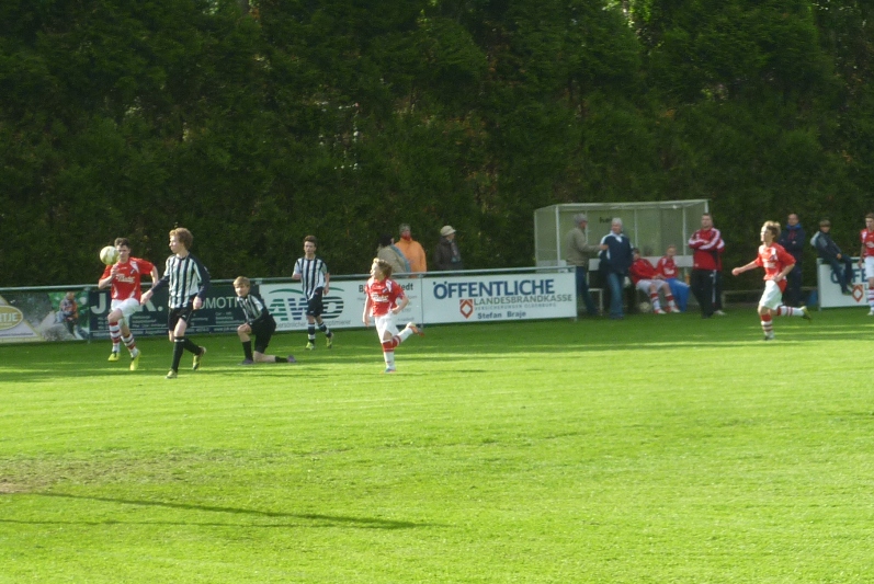 Am Samstag fand ein riesiges Turnier in Borssum /Emden mit insgesamt 24 G-Jugend-Mannschaften statt. Wir starteten in der Gruppe 1 mit 6 Mannschaften. Das Auftaktspiel wurde gegen den späteren Gruppensieger Grün-Weiß Neukölln mit 5 : 1 verloren. Weiter ging es gegen FT Emden mit einem 4:1 Sieg. Das Spiel gegen den Gruppenzweiten BW Borssum endete 1:1, obwohl wir hier mit einer hohen Niederlage rechneten. Die nächsten Spiele gegen Loppersum und Suurhusen wurden mit 9:0 bzw. 4:1 gewonnen. Als Gruppen-Dritter spielten wir dann in der Europaleaque, siegten 2 mal und mussten aufgrund des Kräfteverlustes eine unglückliche Niederlage kassieren.