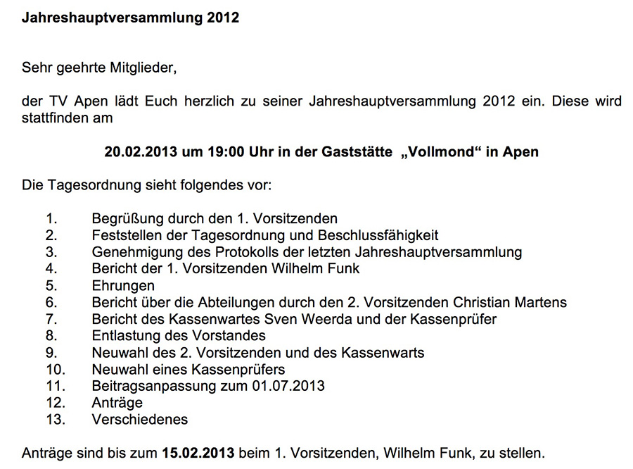 Die Jahreshauptversammlung unseres Vereins findet in diesem Jahr am Mittwoch, 20.02.2013 statt.