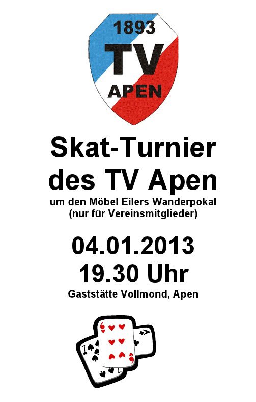 Am kommenden Freitag geht es in der Gaststätte "Vollmond" mal wieder im vereinsinternen Skatturnier um den Möbel-Eilers-Wanderpokal. Start ist um 19.30 Uhr, wie immer können nur Vereinsmitglieder des TV Apen teilnehmen. Gut Blatt!