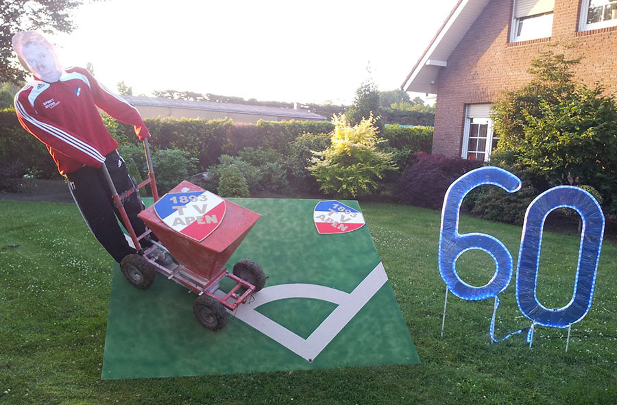 Anlässlich seines 60. Geburtstages überraschten Vorstand und Fußballerabordnung Schweer Meyer am Freitag, in Form eines "kleinen Denkmals" in seinem Garten. Darüber hinaus überreichten Sven Weerda und Christian Martens im Namen des ganzen Vereins ein besonderes Präsent