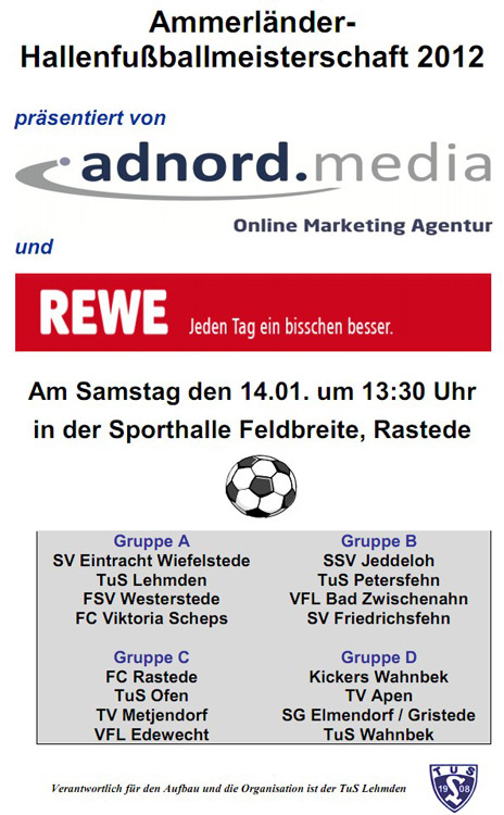Am kommenden Samstag wird ab 13.30 Uhr in der Sporthalle Feldbreite in Rastede die Hallenmeisterschaft des Ammerländer Fußballkreisverbands ausgespielt.