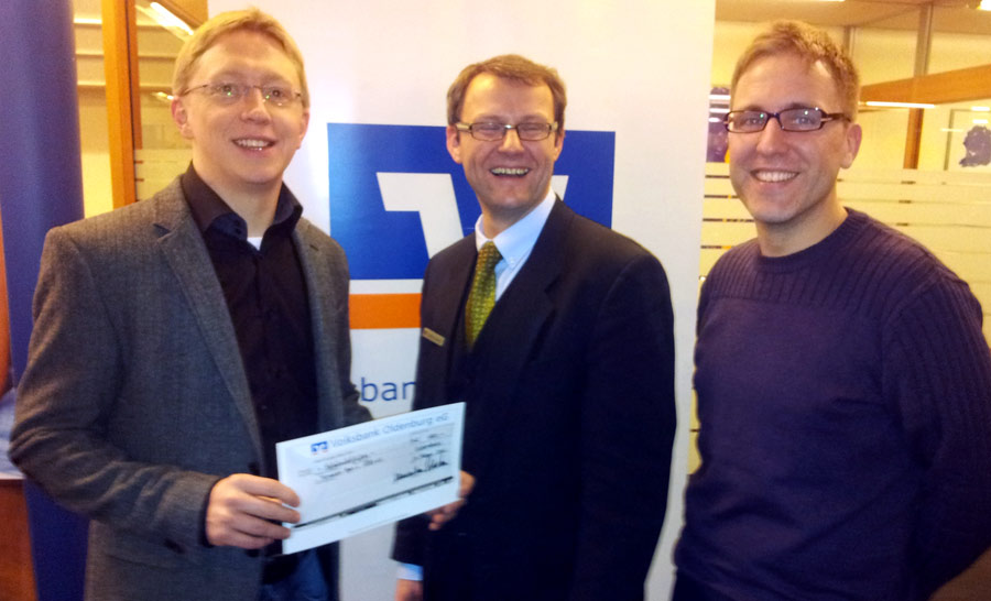 Am Dienstag Abend hatten Christian Martens und Maik Janßen vom TV Apen allen Grund sich zu freuen: Im Rahmen der Ausschüttung des Gewinnsparens der Volksbank Oldenburg bekamen sie vom Aper Geschäftsstellenleiter Markus Leubner einen Scheck in Höhe von 650,- € zur Förderung der Jugendarbeit überreicht.