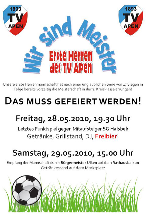 Alle die auf ein spannendes Endspiel um den Meistertitel gehofft haben, werden nun enttäuscht. Denn die Aper haben einen Spieltag vor Saisonende die Meisterschaft klar gemacht. Durch einen kampflosen 5:0 Sieg über Scheps, die nicht angetreten sind und eine 1:2 Niederlage von Halsbek gegen Wiefelstede liegen die Aper nun unaufholbar mit 5 Punkten Vorsprung auf Platz 1.