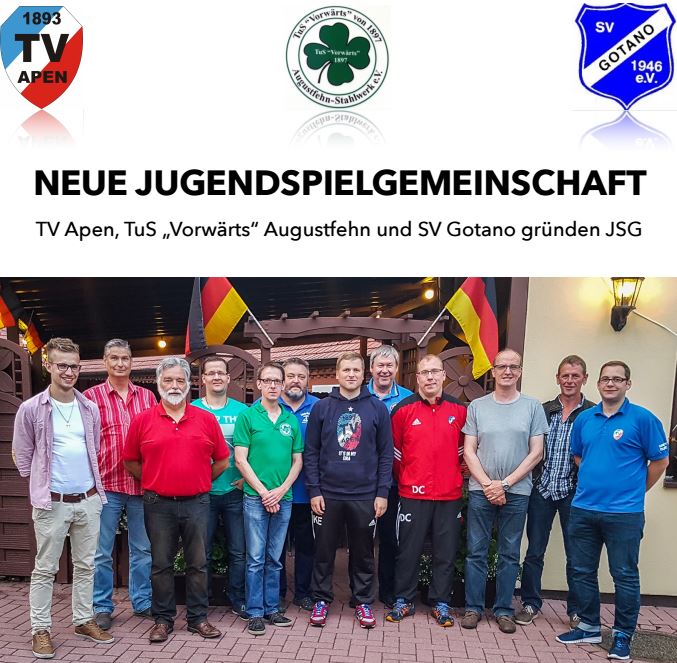 Die drei Vereine TV Apen, TuS „Vorwärts“ Augustfehn und SV Gotano werden ab der kommenden Spielzeit 2016/17 eine Jugendspielgemeinschaft bilden. Darauf einigten sich die Verantwortlichen